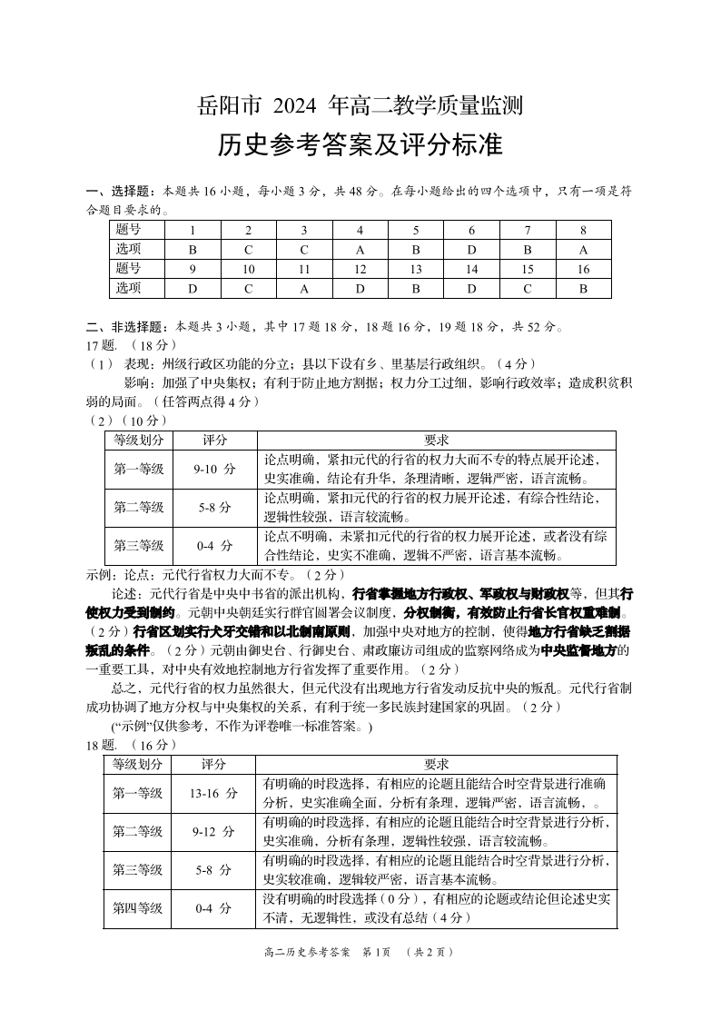 湖南省岳阳市2023-2024学年高二下学期期末考试历史答案