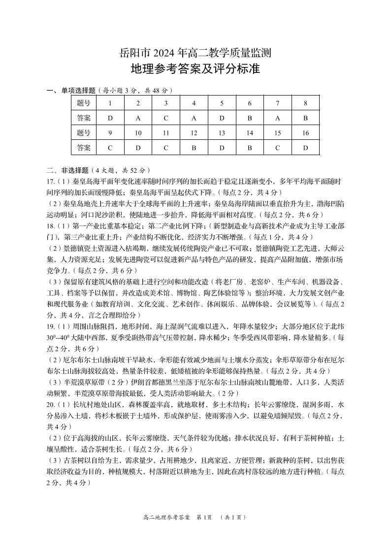 湖南省岳阳市2023-2024学年高二下学期期末考试地理答案