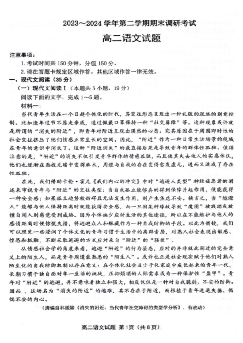 江苏省连云港市2023-2024学年第二学期高二年级下学期期末考试语文