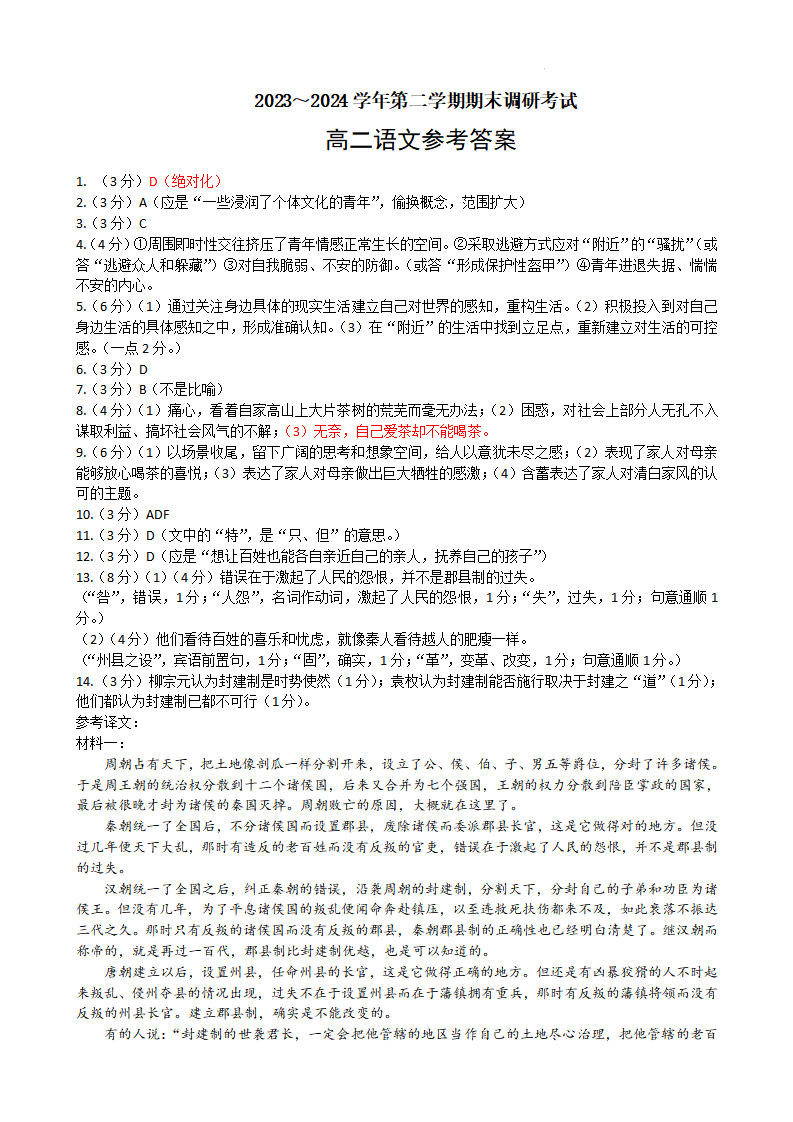 江苏省连云港市2023-2024学年第二学期高二年级下学期期末考试语文答案