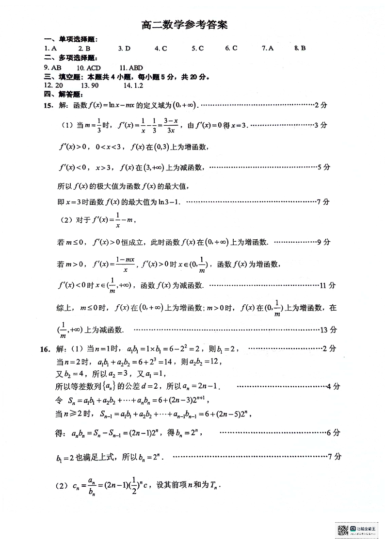 江苏省连云港市2023-2024学年第二学期高二年级下学期期末考试数学答案
