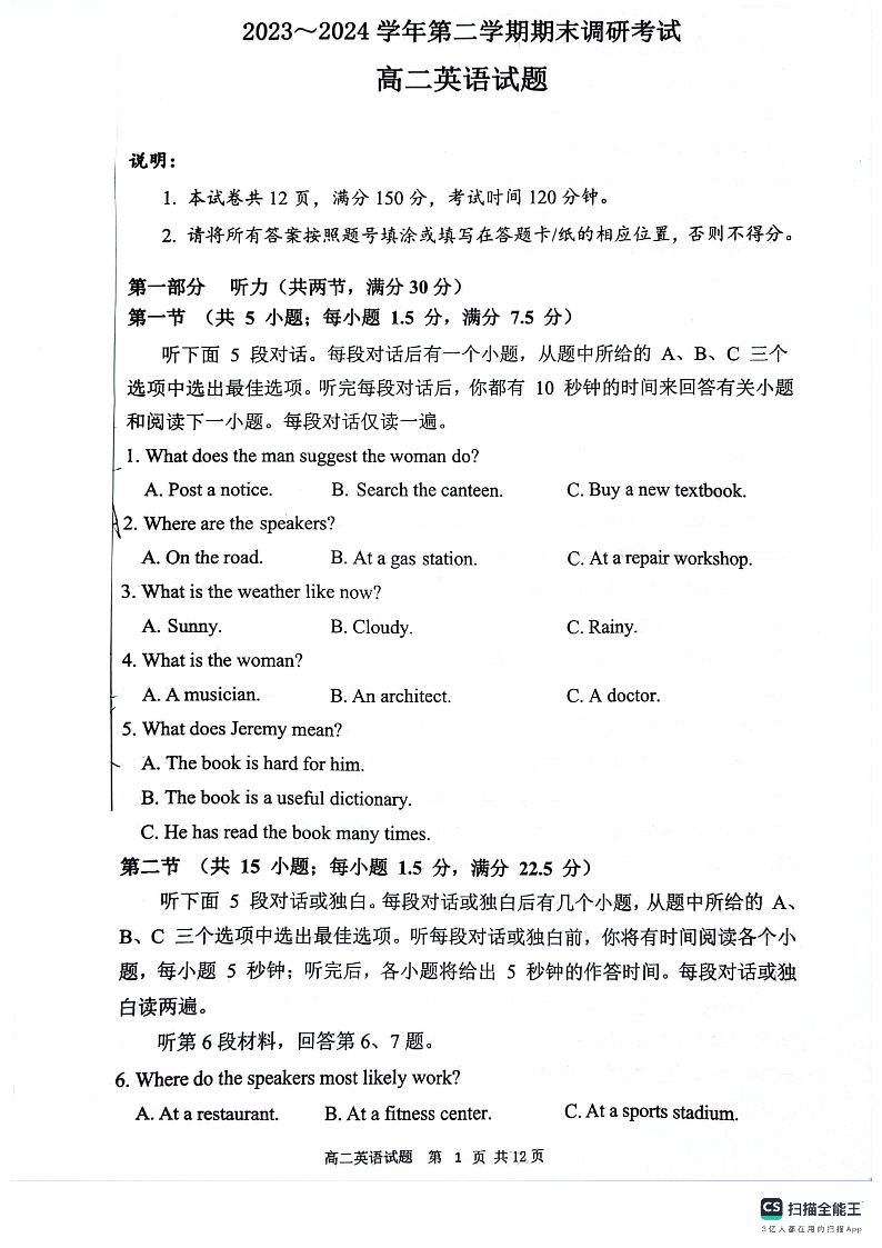江苏省连云港市2023-2024学年第二学期高二年级下学期期末考试英语