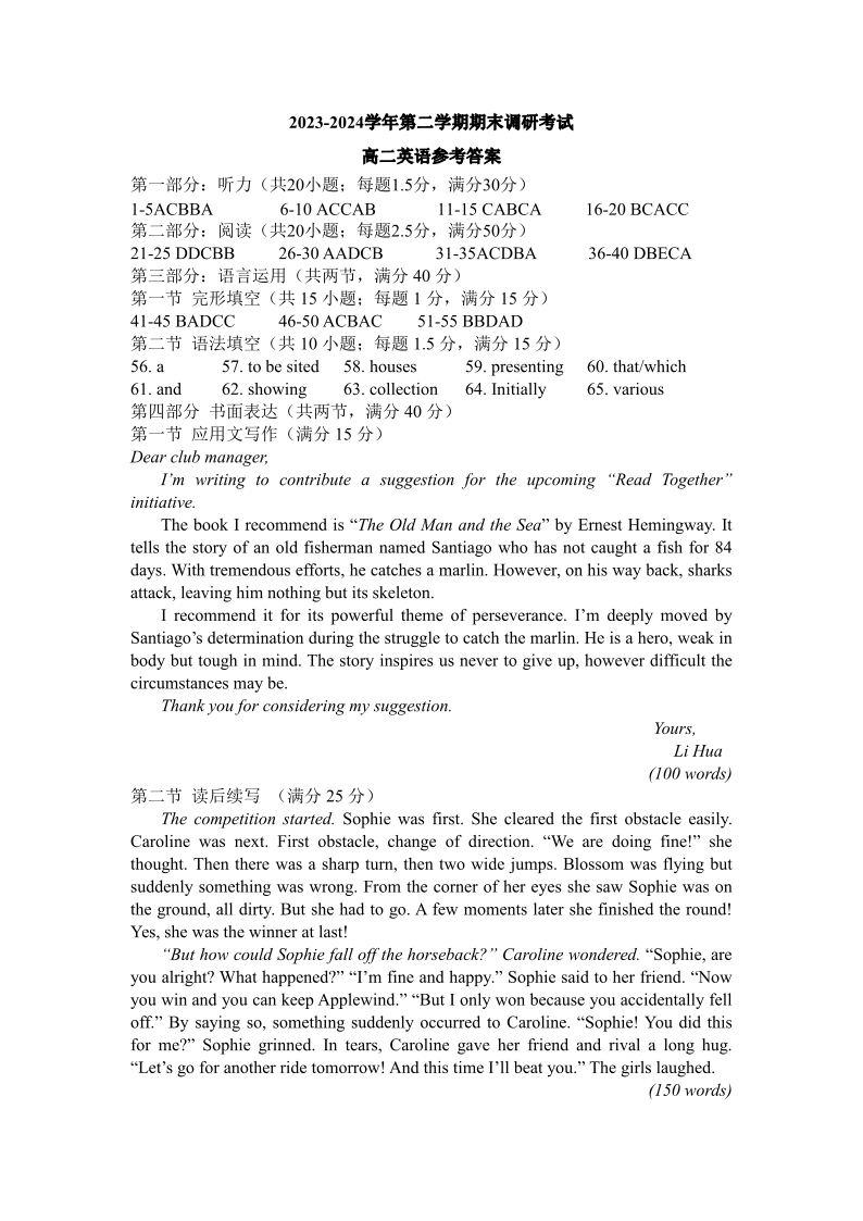 江苏省连云港市2023-2024学年第二学期高二年级下学期期末考试英语答案
