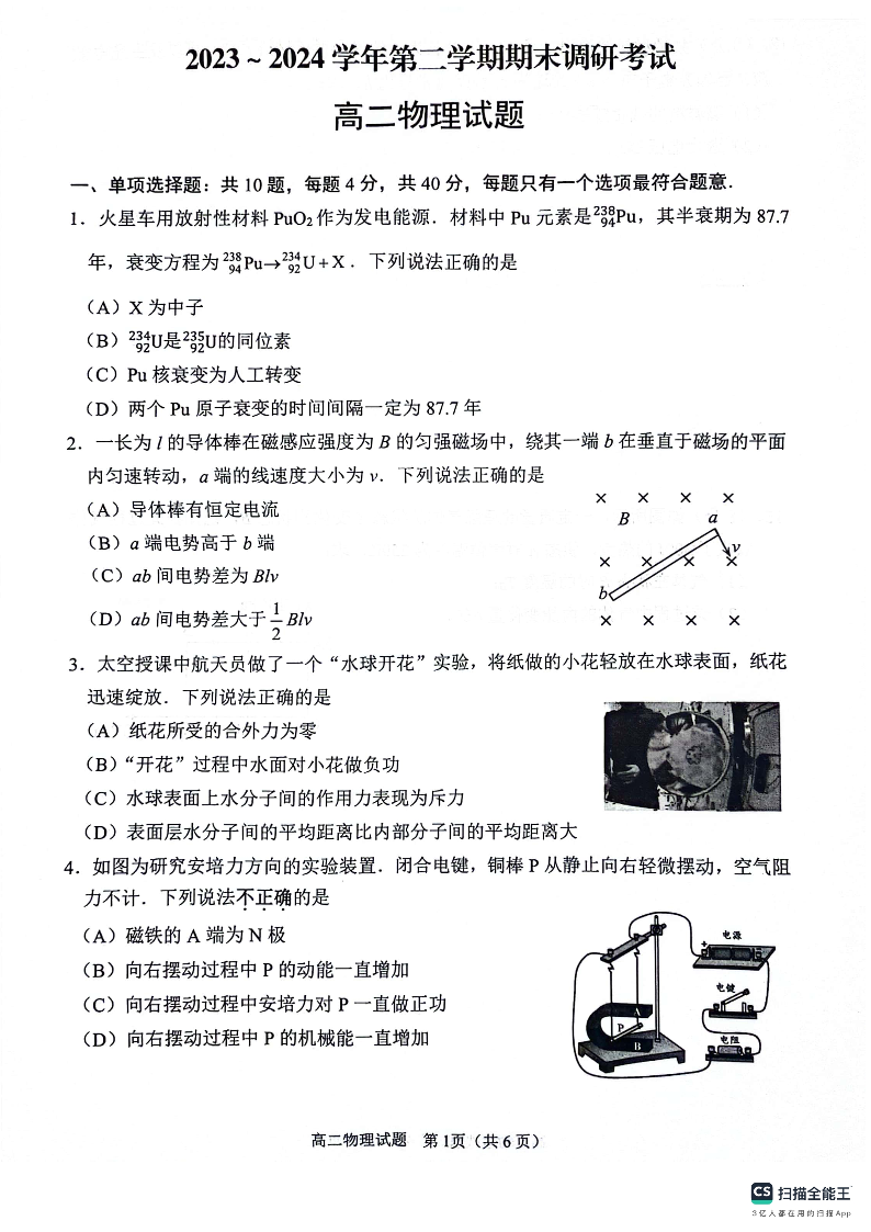江苏省连云港市2023-2024学年第二学期高二年级下学期期末考试物理
