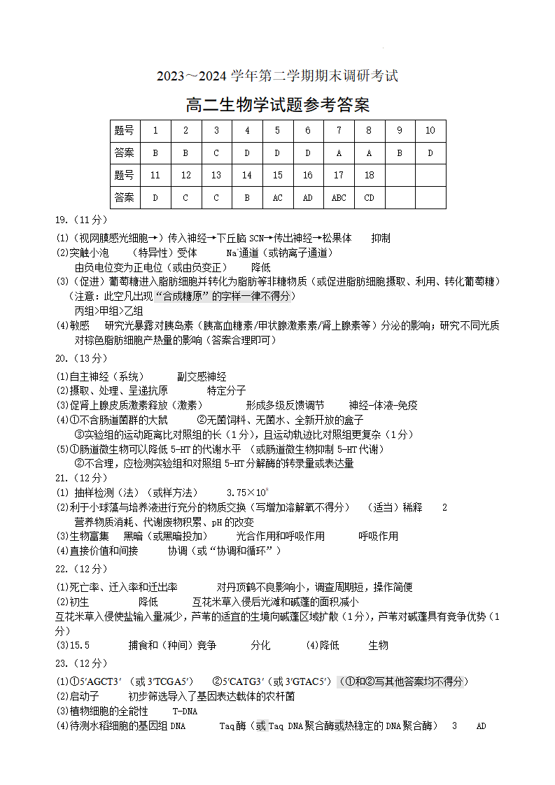 江苏省连云港市2023-2024学年第二学期高二年级下学期期末考试生物答案