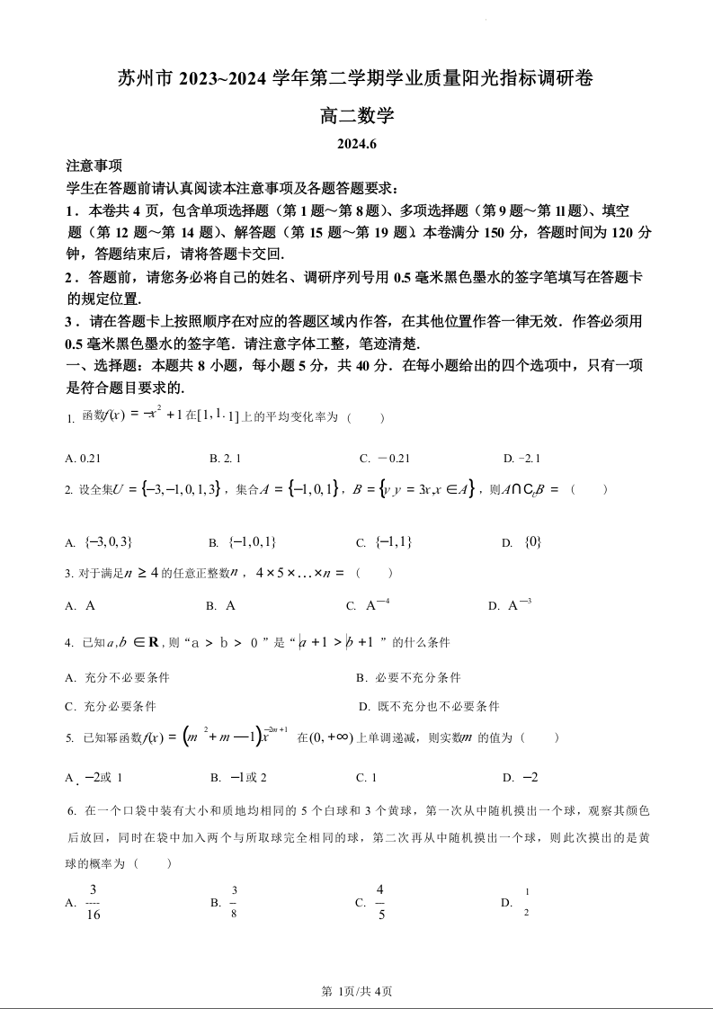 江苏省苏州市2023-2024学年高二下学期6月期末考试数学(原卷版)