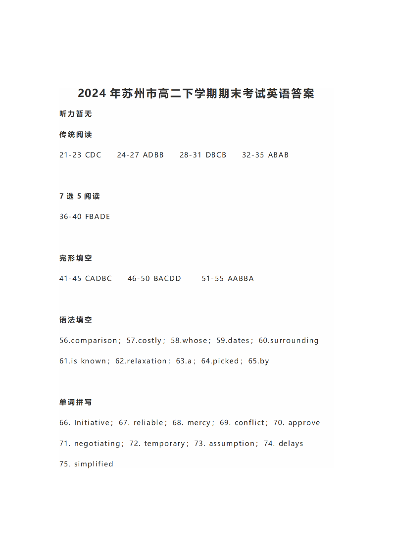 江苏省苏州市2023-2024学年高二下学期6月期末考试英语答案