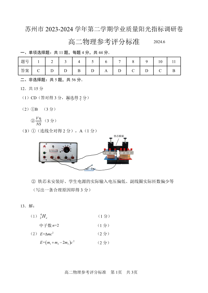 江苏省苏州市2023-2024学年高二下学期6月期末考试物理答案