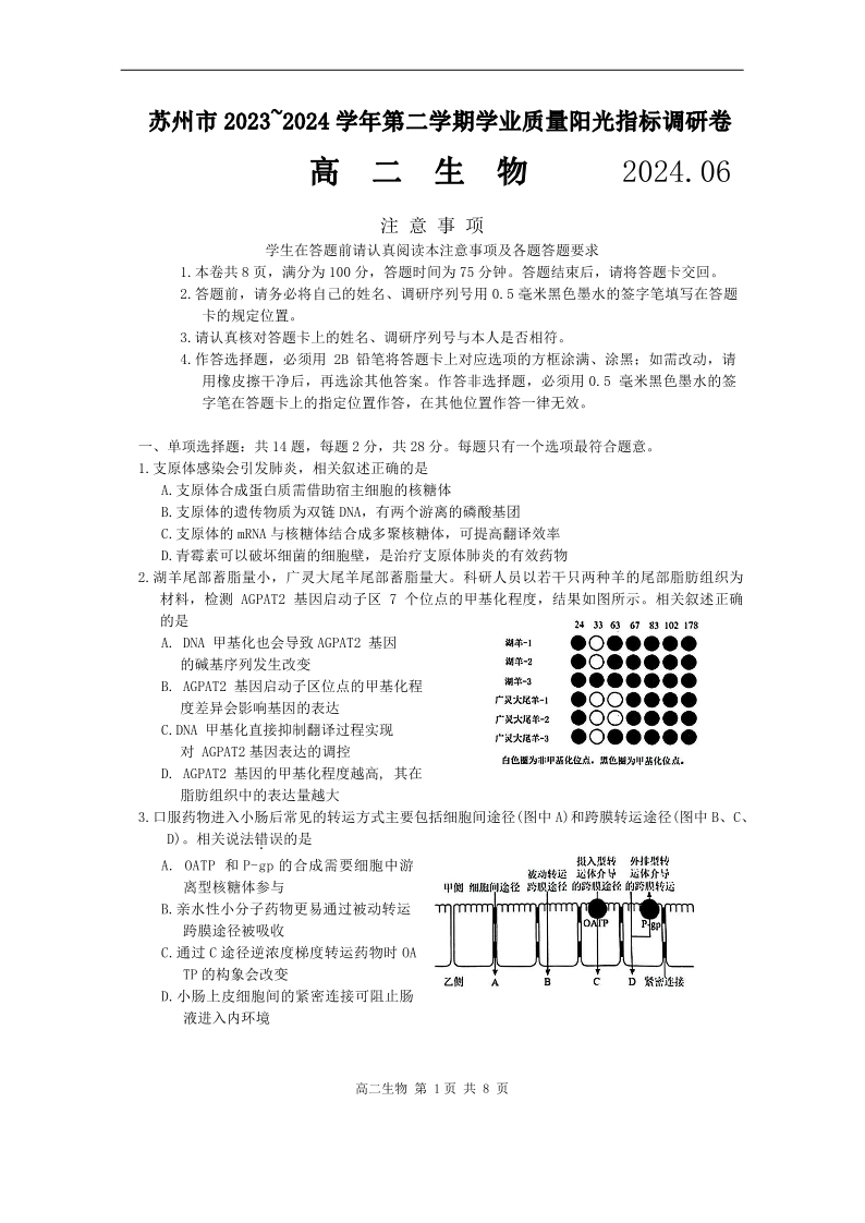 江苏省苏州市2023-2024学年高二下学期6月期末考试生物