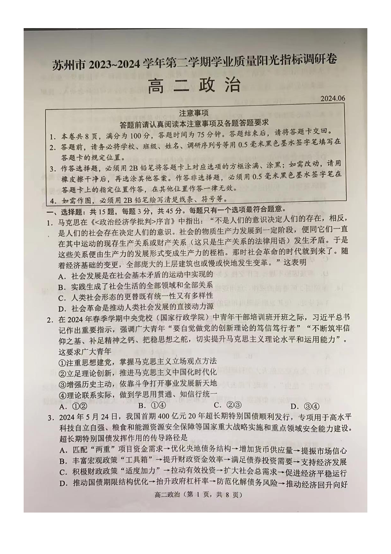 江苏省苏州市2023-2024学年高二下学期6月期末考试政治