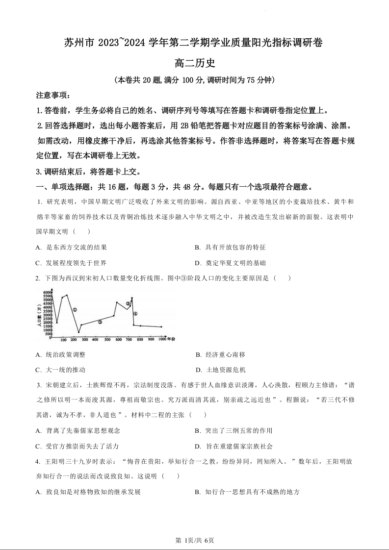 江苏省苏州市2023-2024学年高二下学期6月期末考试历史(原卷版)
