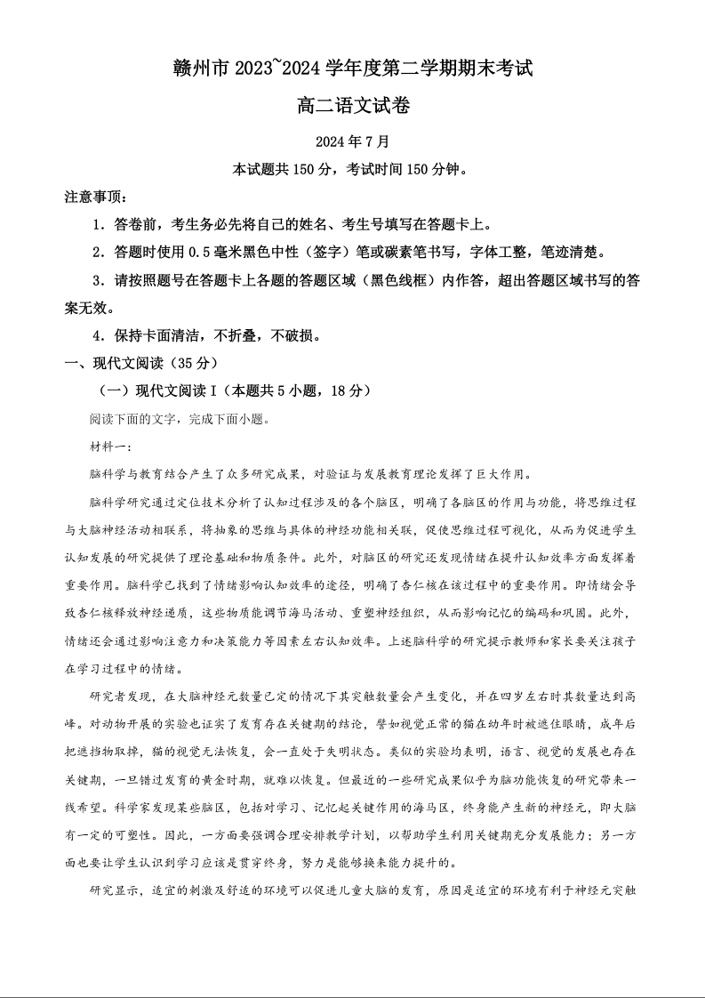 江西省赣州市高2025届下学期7月期末考试语文+答案