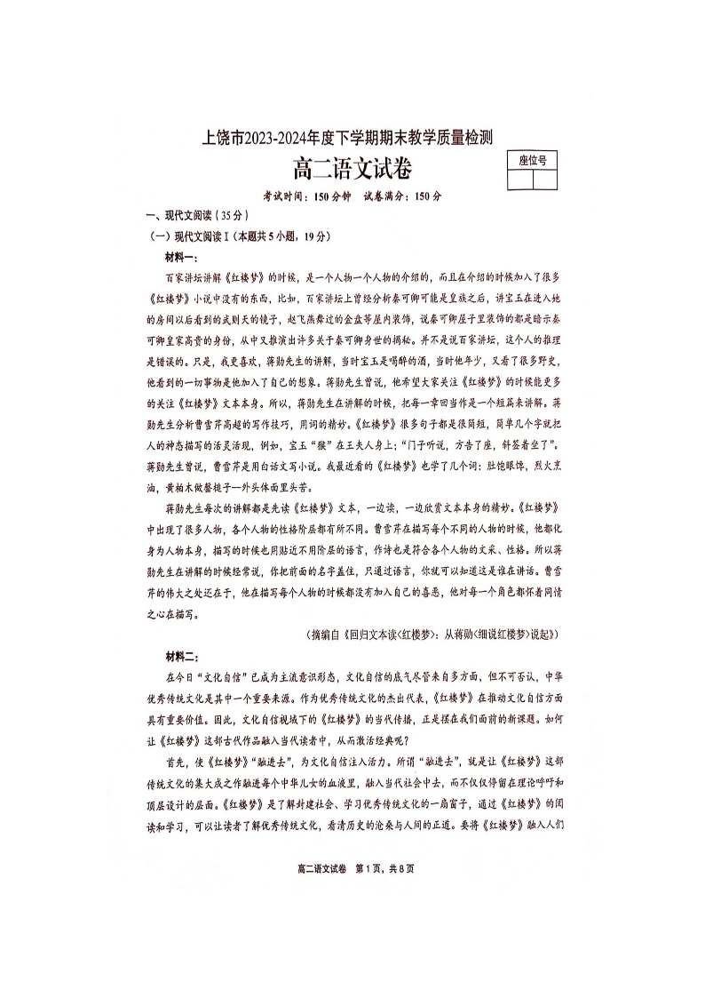 江西省上饶市高2025届下学期期末教学质量检测语文