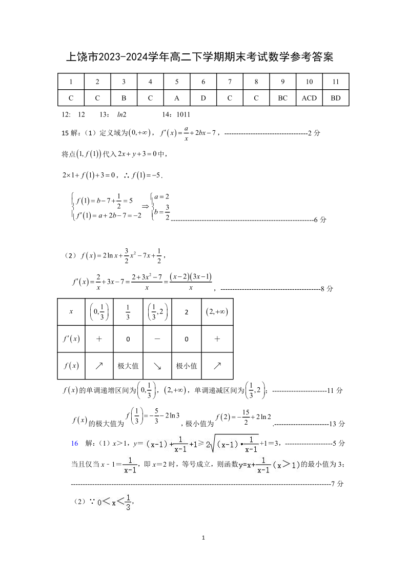 江西省上饶市高2025届下学期期末教学质量检测数学答案