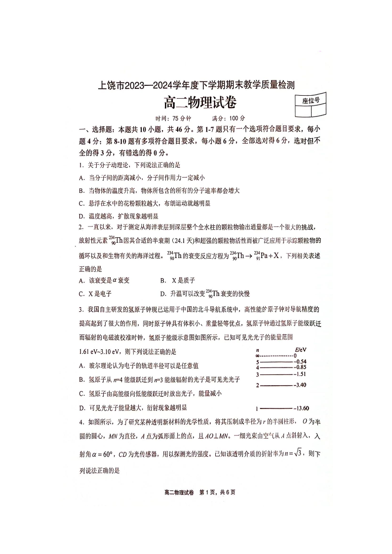 江西省上饶市高2025届下学期期末教学质量检测物理