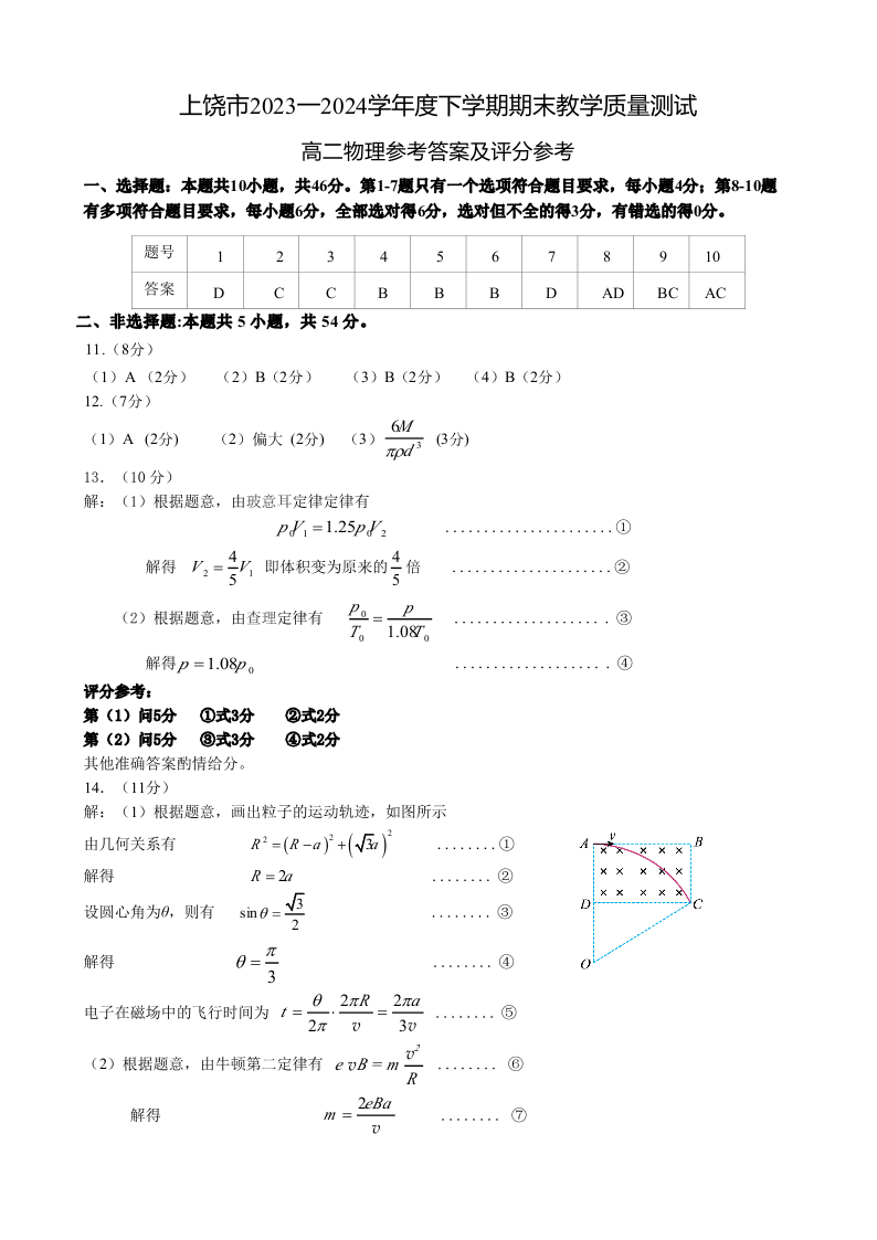 江西省上饶市高2025届下学期期末教学质量检测物理答案