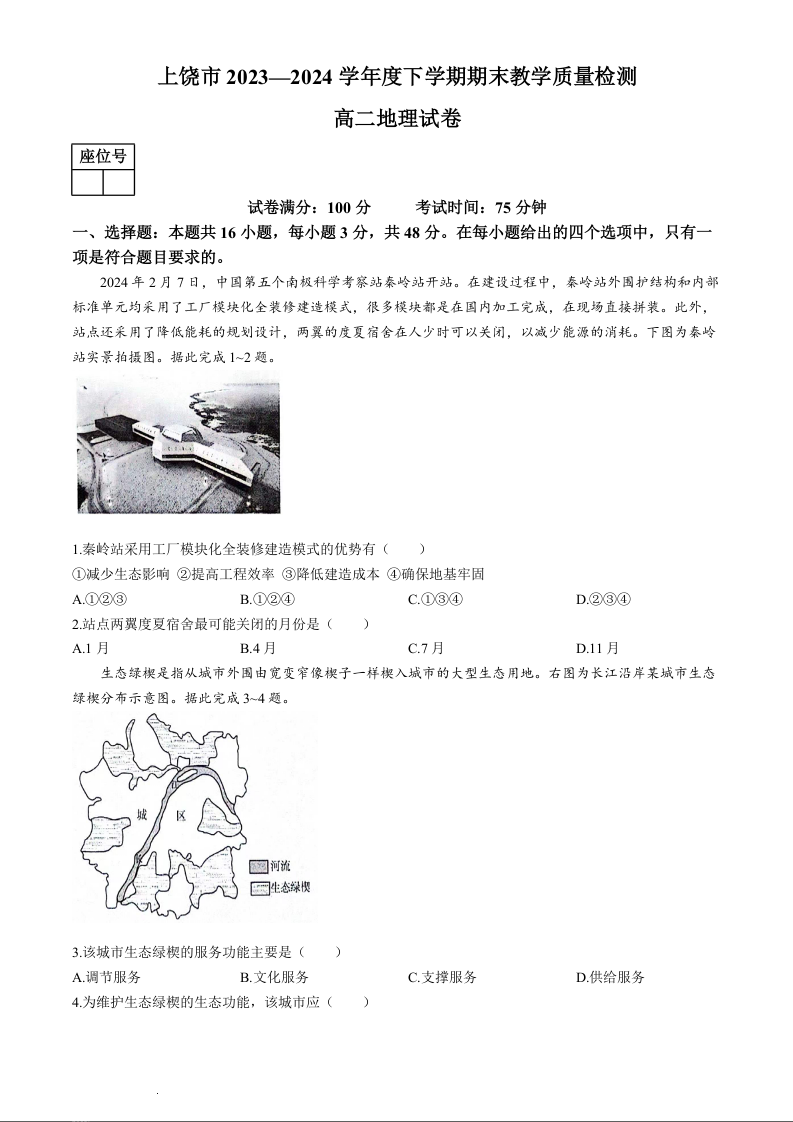 江西省上饶市高2025届下学期期末教学质量检测地理+答案
