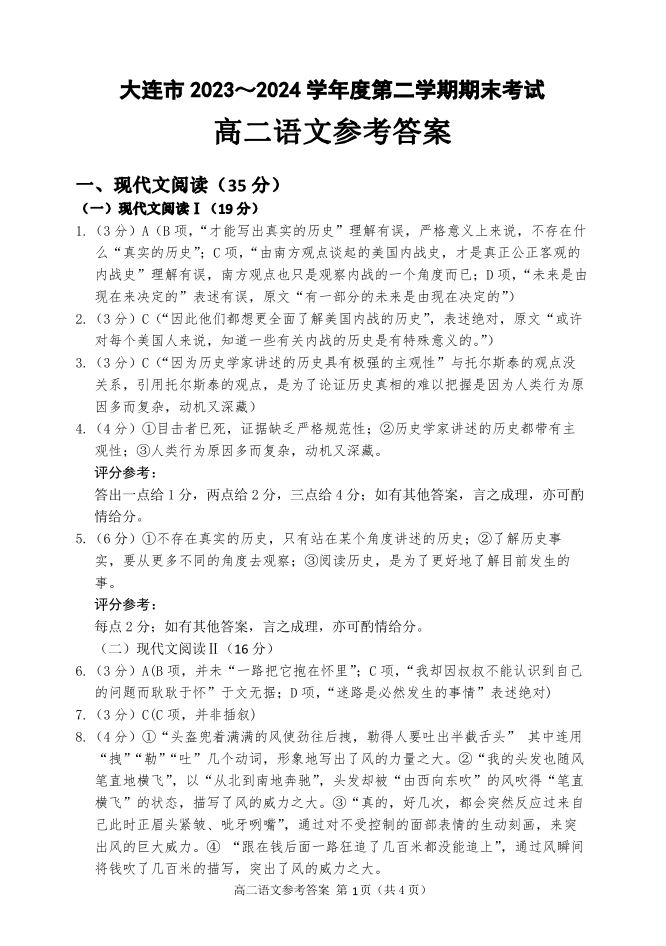 辽宁省大连市高2025届下学期期末考试语文答案