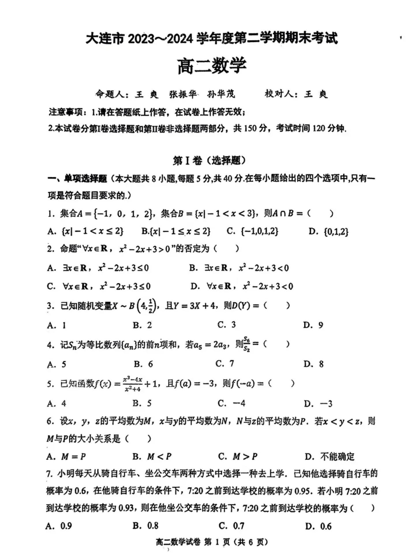 辽宁省大连市高2025届下学期期末考试数学+答案