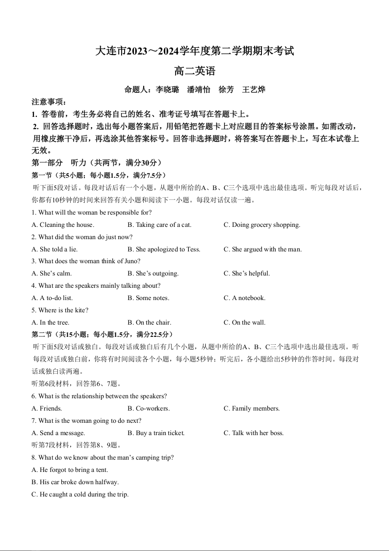 辽宁省大连市高2025届下学期期末考试英语+答案