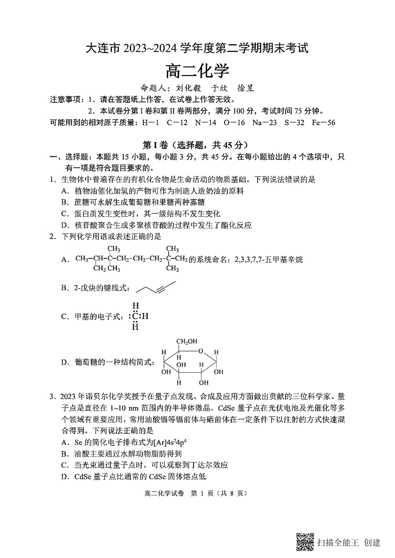 辽宁省大连市高2025届下学期期末考试化学