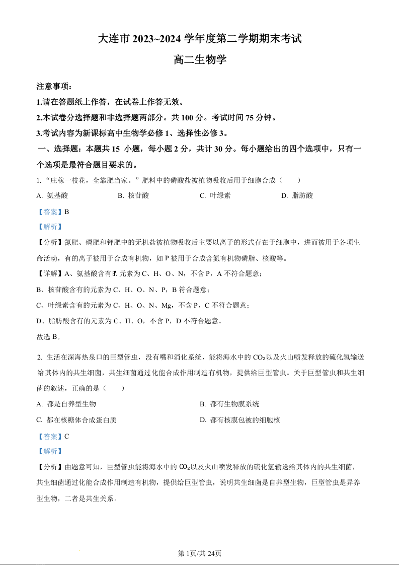 辽宁省大连市高2025届下学期期末考试生物(精品解析版)