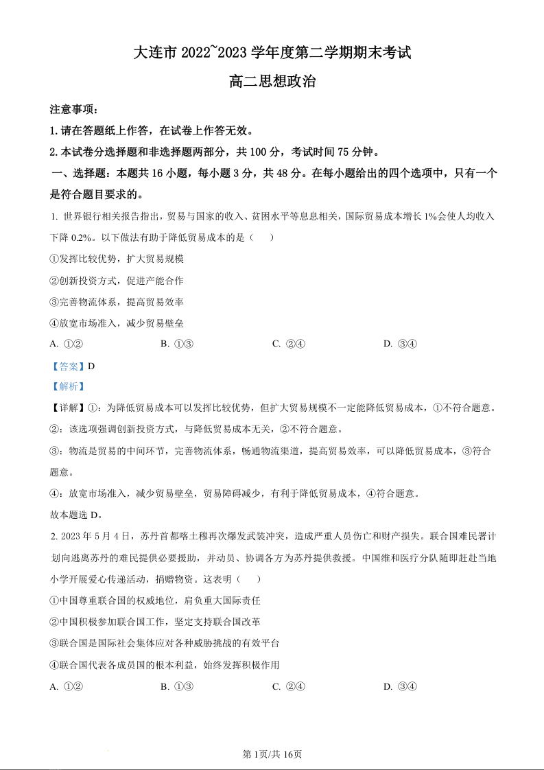 辽宁省大连市高2025届下学期期末考试政治(精品解析版)