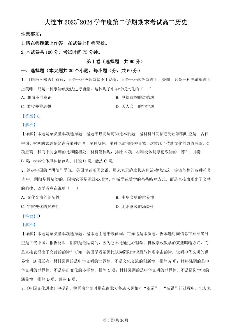 辽宁省大连市高2025届下学期期末考试历史(精品解析版)