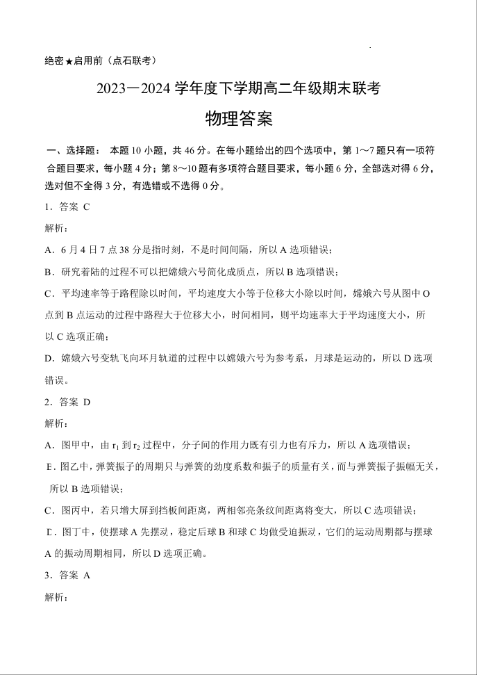 辽宁省点石联考高2025届下学期7月期末联考物理答案