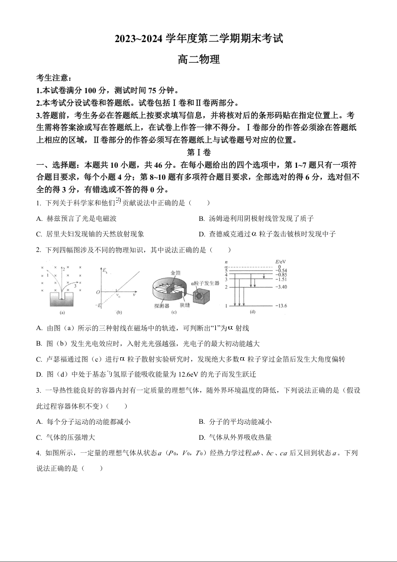 辽宁省锦州市高2025届下学期期末考试物理+答案