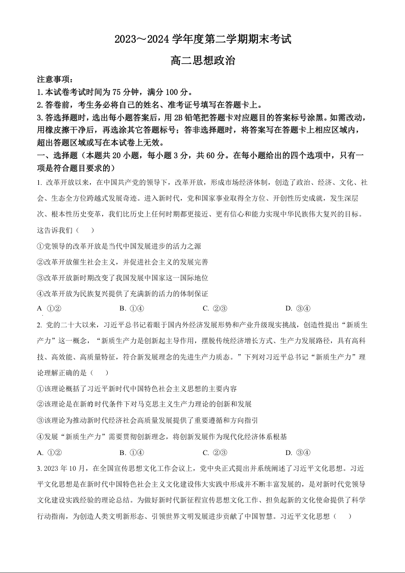 辽宁省锦州市高2025届下学期期末考试政治+答案
