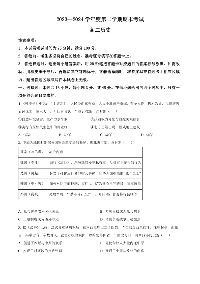 辽宁省锦州市高2025届下学期期末考试历史+答案