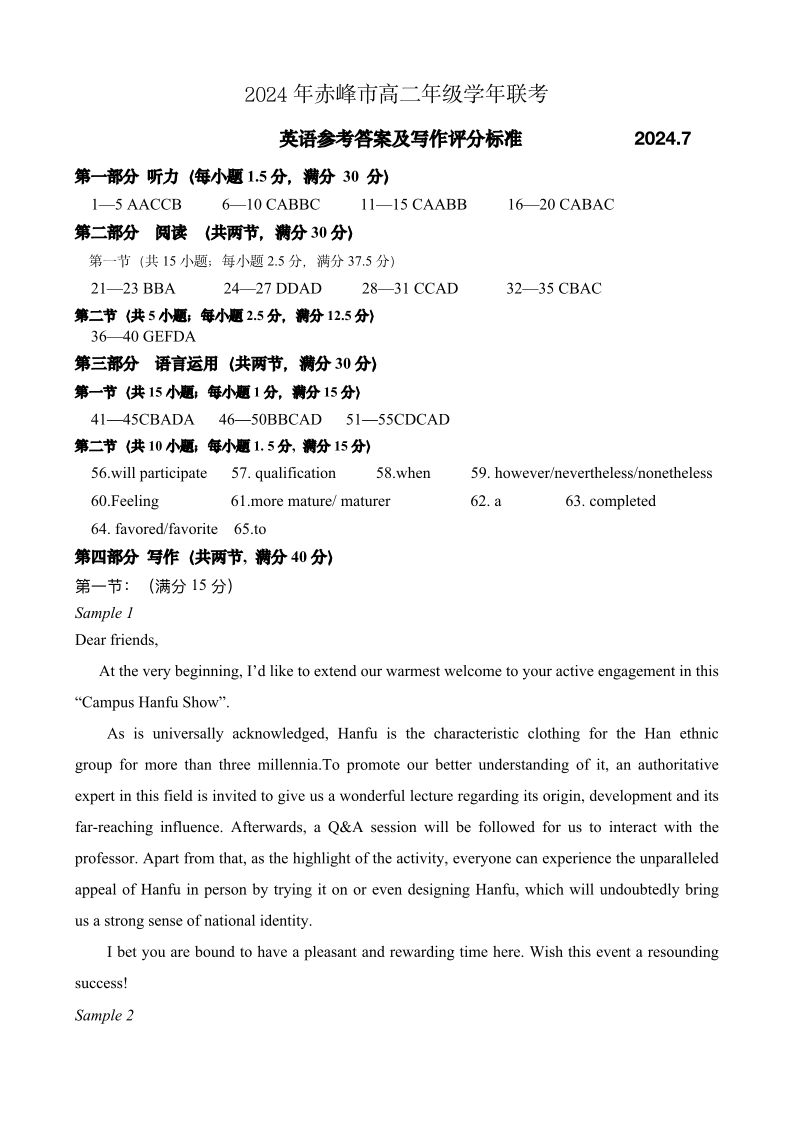 内蒙古自治区赤峰市高2025届下学期7月期末考试英语答案