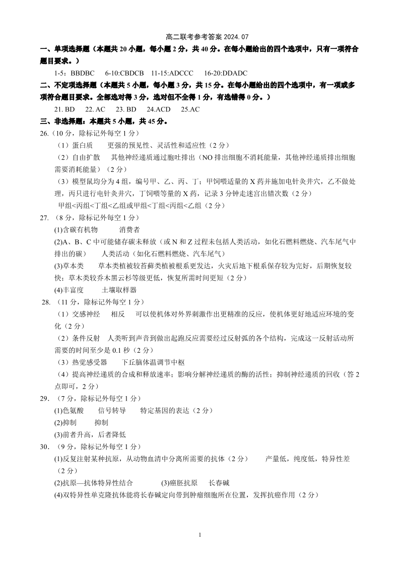内蒙古自治区赤峰市高2025届下学期7月期末考试生物答案
