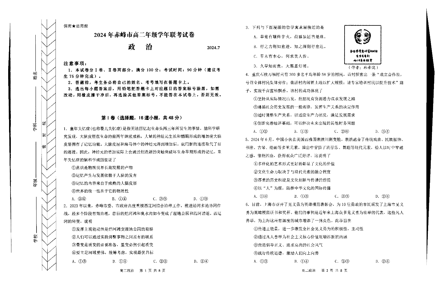 内蒙古自治区赤峰市高2025届下学期7月期末考试政治