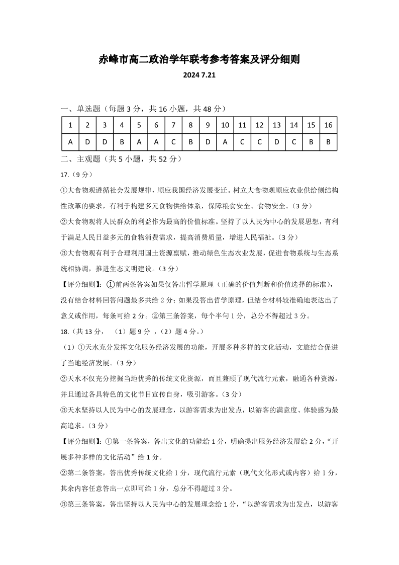 内蒙古自治区赤峰市高2025届下学期7月期末考试政治答案