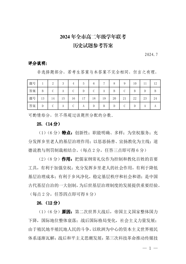 内蒙古自治区赤峰市高2025届下学期7月期末考试历史答案