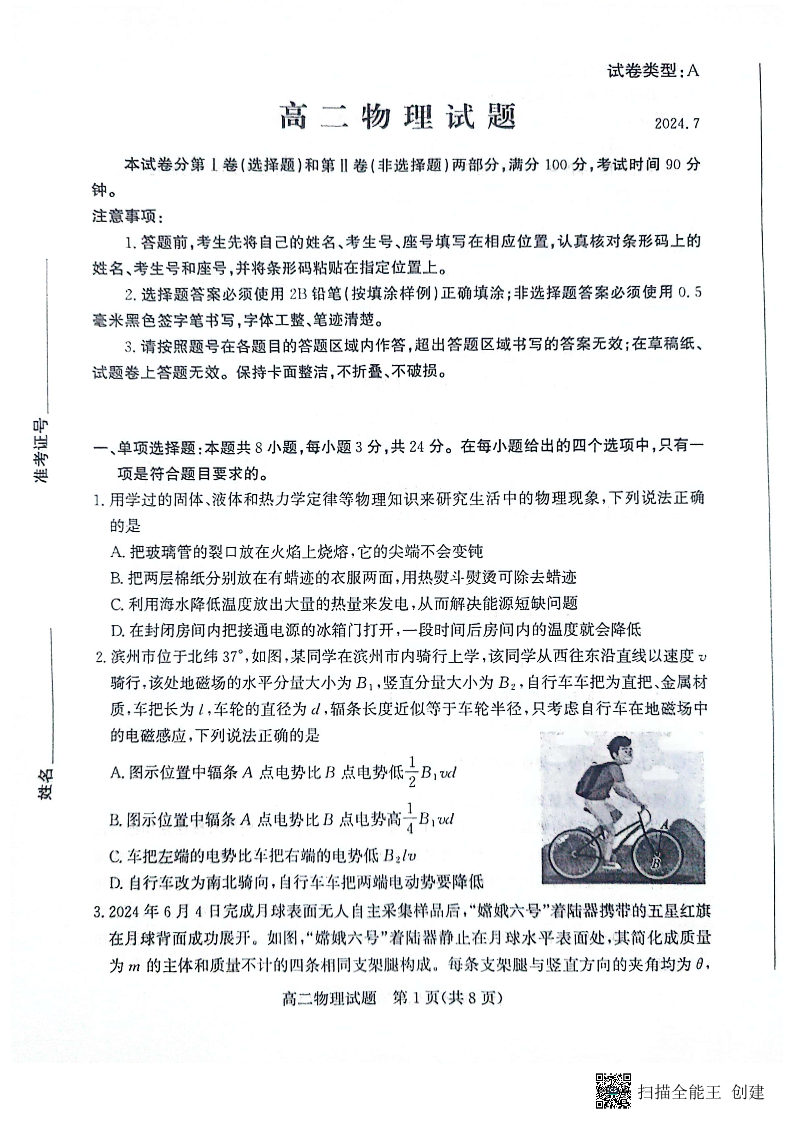 山东省滨州市高2025届下学期7月期末教学质量检测物理
