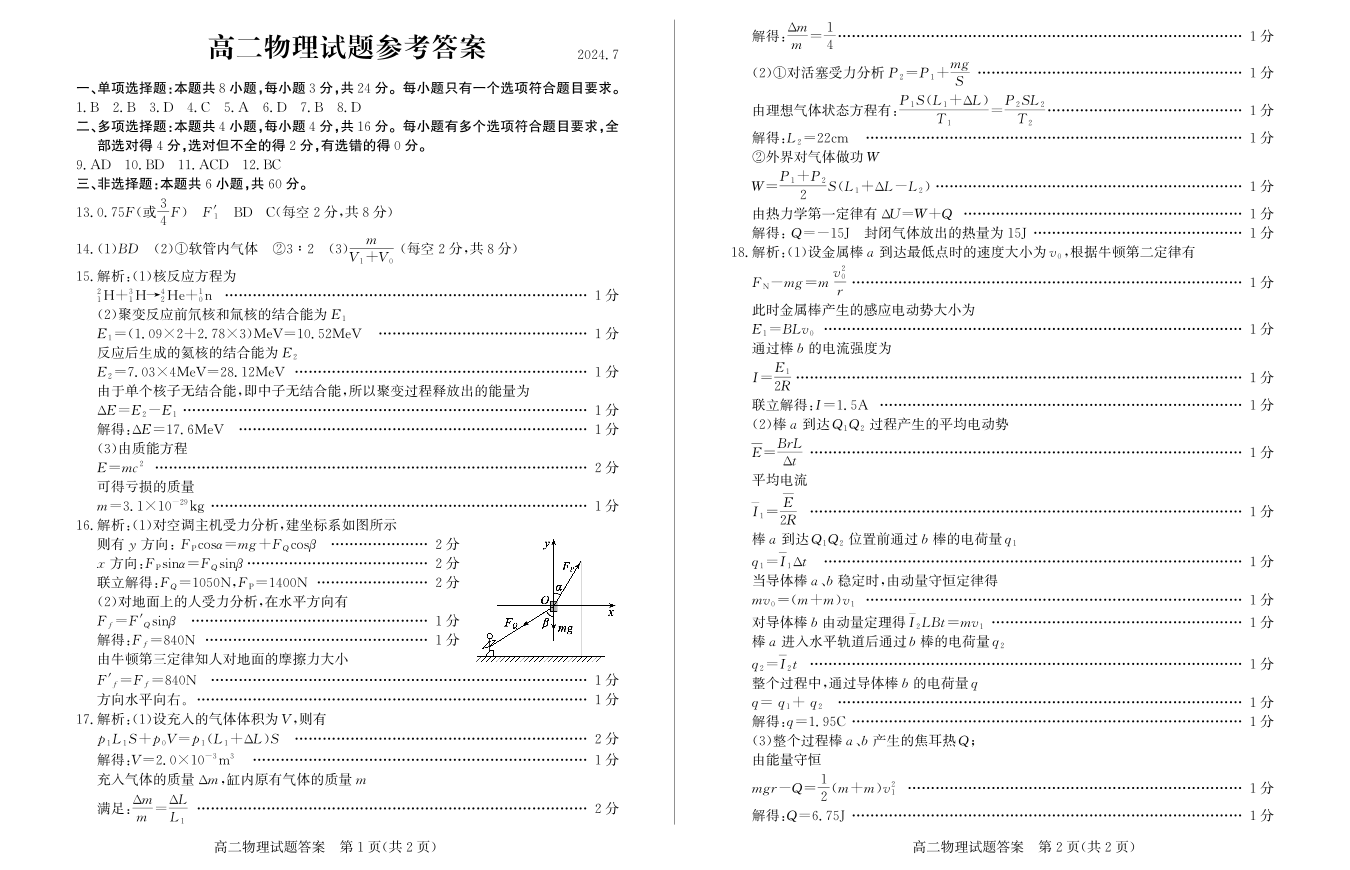 山东省滨州市高2025届下学期7月期末教学质量检测物理答案