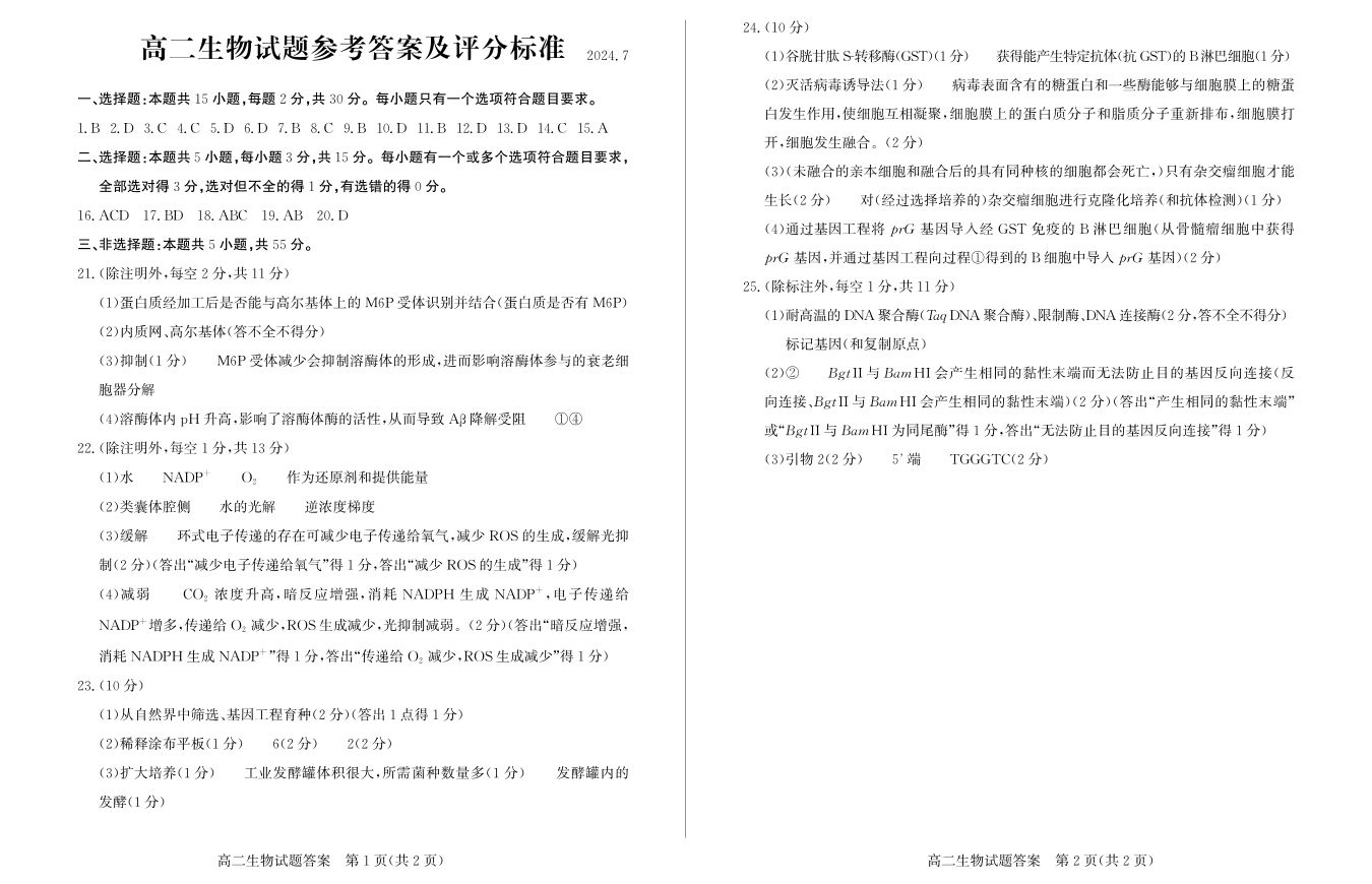 山东省滨州市高2025届下学期7月期末教学质量检测生物答案