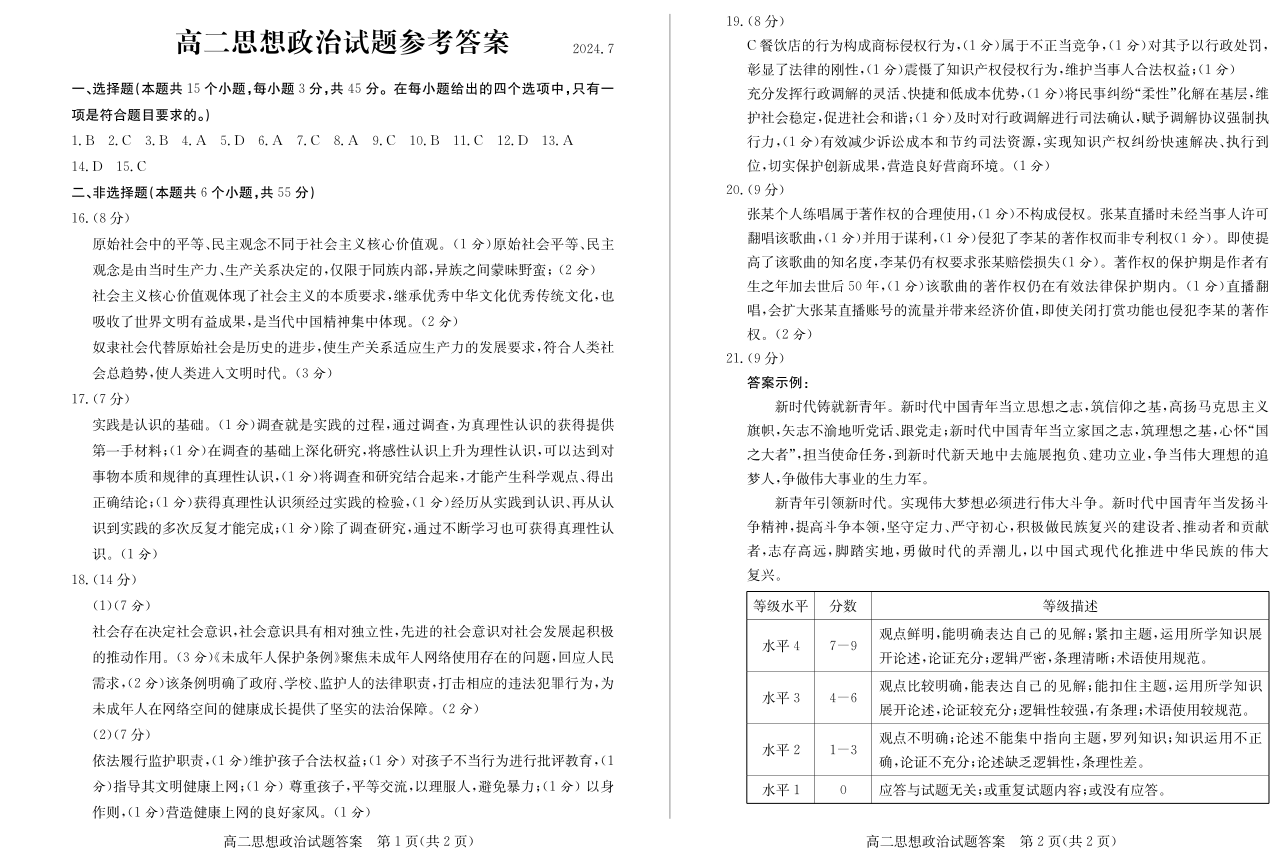 山东省滨州市高2025届下学期7月期末教学质量检测政治答案
