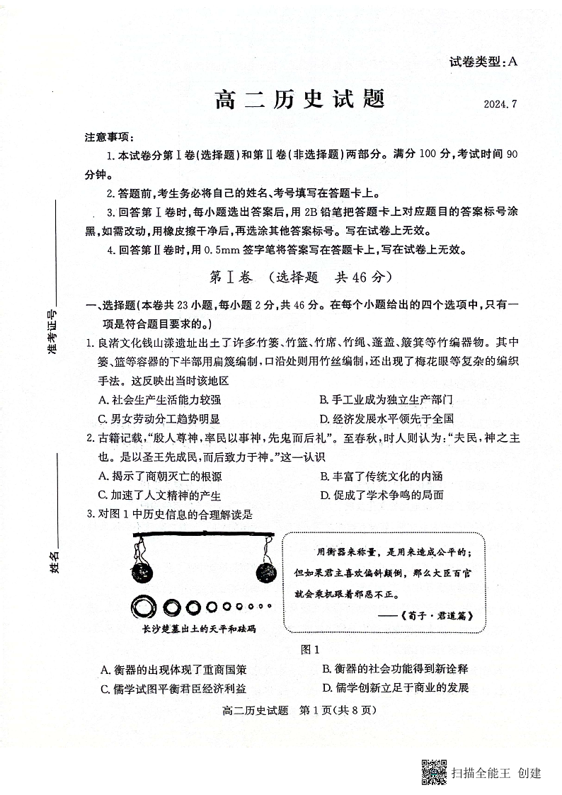 山东省滨州市高2025届下学期7月期末教学质量检测历史