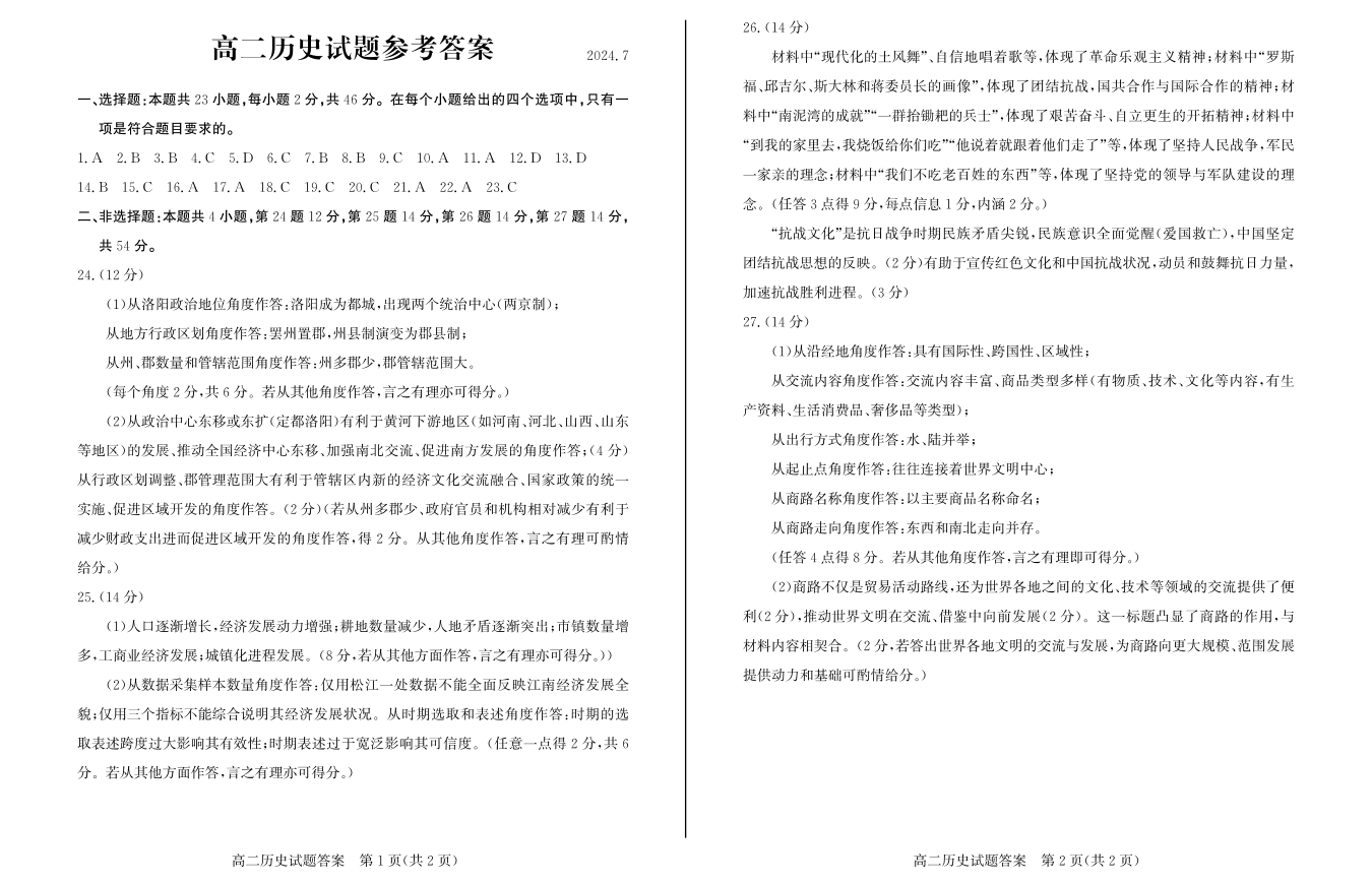山东省滨州市高2025届下学期7月期末教学质量检测历史答案