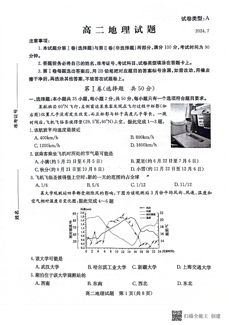 山东省滨州市高2025届下学期7月期末教学质量检测地理