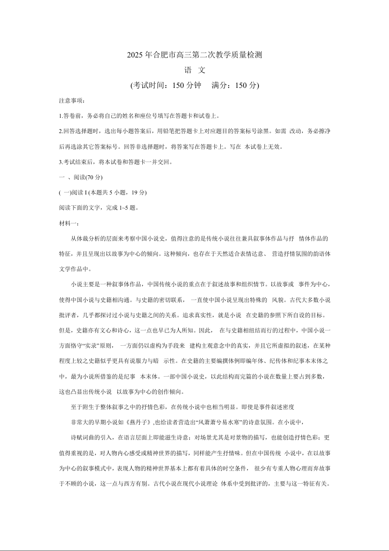 安徽省合肥市2025届高三第二次教学质量检测(合肥二模)语文
