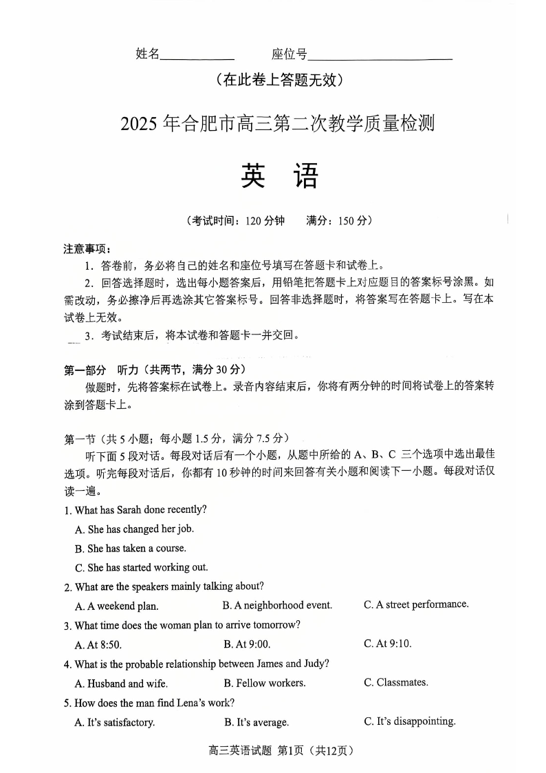 安徽省合肥市2025届高三第二次教学质量检测(合肥二模)英语
