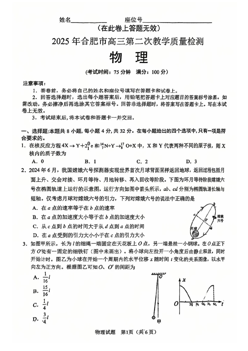 安徽省合肥市2025届高三第二次教学质量检测(合肥二模)物理+答案