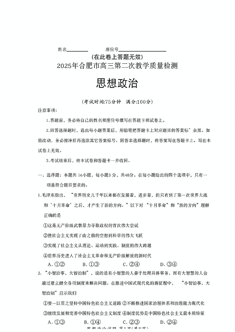 安徽省合肥市2025届高三第二次教学质量检测(合肥二模)政治+答案