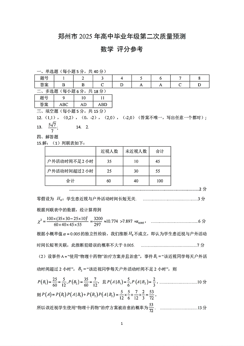 河南省郑州市2025届高中毕业年级第二次质量预测(郑州二模)数学答案