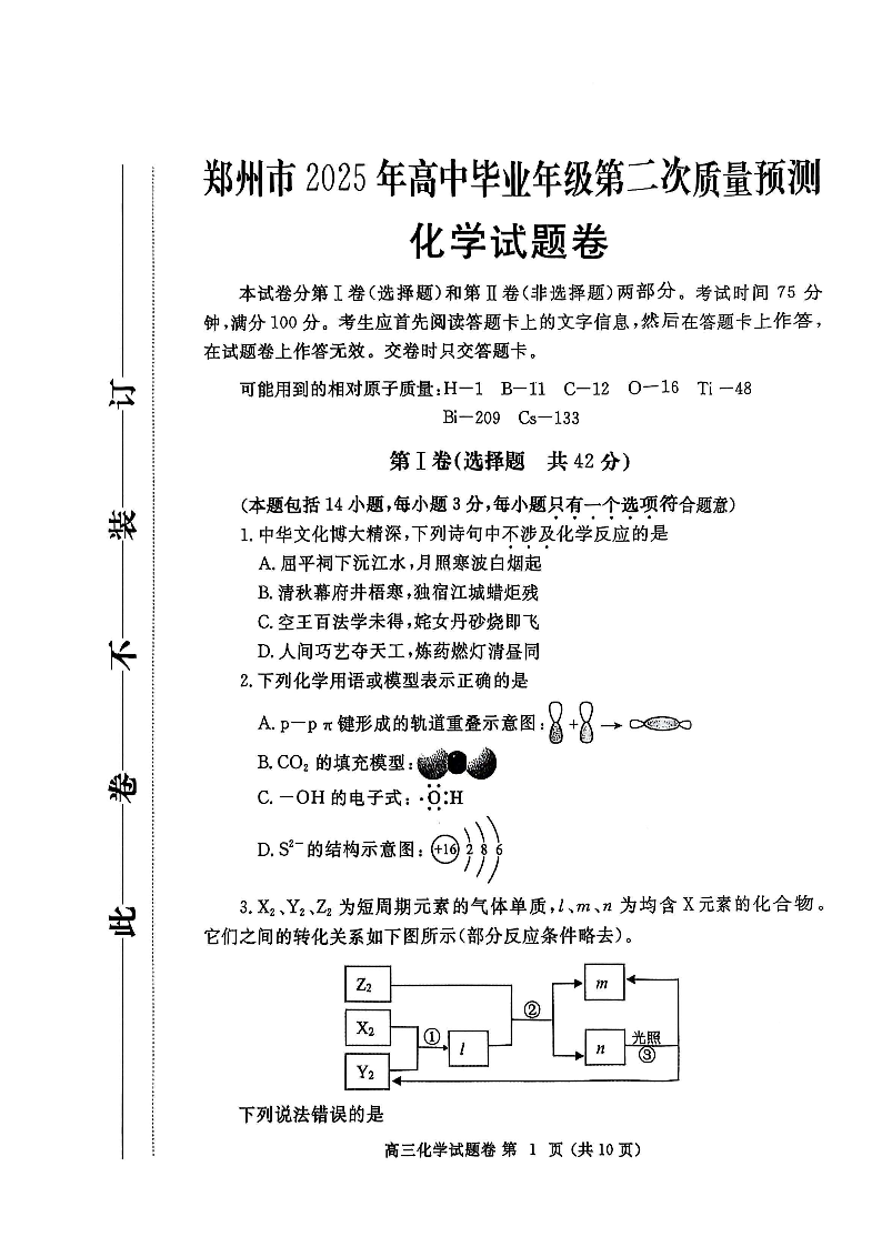 河南省郑州市2025届高中毕业年级第二次质量预测(郑州二模)化学